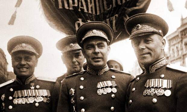 В центре — зам. командира по политической части сводного полка 4-го Украинского фронта, генерал-майор Леонид Ильич Брежнев во время Парада Победы на Красной площади, 24 июня 1945 года