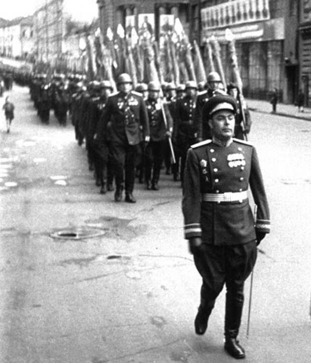 Брежнев во главе колонны сводного полка 4-ого Украинского фронта, который следует на Красную площадь для участия в Параде Победы. 24 июня 1945 год.