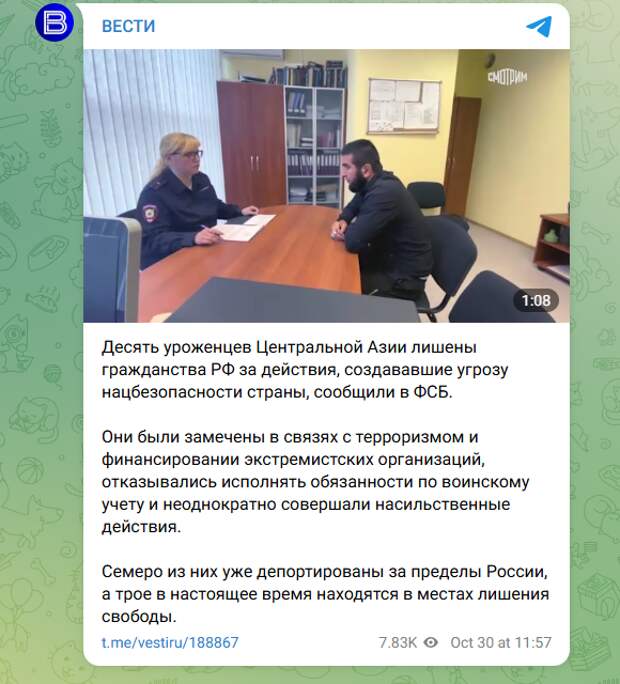 Десяток уроженцев Центральной Азии лишены паспортов не абы за что - их уличили в "действиях, создававших угрозу национальной безопасности" для России. Об этом сообщили в ФСБ. Отметим, что конкретно в этом случае лишение гражданства - мера, которую применили за бандитизм, связи с террористами, за спонсирование террористических организаций и другие серьёзные преступления.