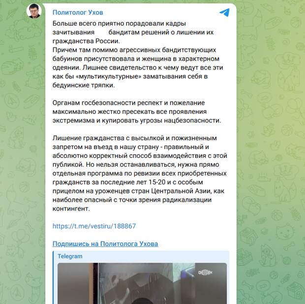 Политолог Илья Ухов не скрыл радости, отметив при этом, что среди прочих в списке нарушителей оказалась "женщина в характерном одеянии". Она, добавим, лишилась гражданства России за финансирование террористической организации.Очередная партия мигрантов утратила статус "новых граждан" России. Процесс очищения страны от откровенно опасных для неё элементов начался и неумолимо идёт.