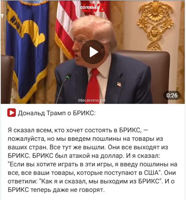 БРИКС для Трампа это смертельная кость в горле. Не разжевать, не проглотить! Всё таки пуля голову задела...