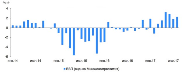 После краткосрочного замедления в июле темпы роста ВВП в августе вновь вышли на уровень, превышающий 2%, сообщается в обзоре Минэкономразвития. Такой темп сохранится до конца года. Основной вклад в ускорение роста внесли отрасли, которые в прошлом месяце показали слабые результаты из-за действия временных факторов, – сельское хозяйство и промышленность. |