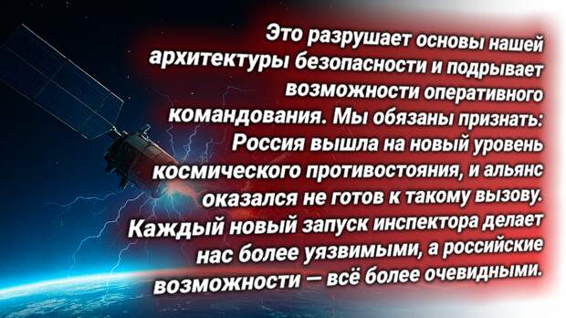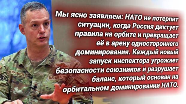 «Россия нарушает цивилизованные правила военного космоса. Сегодня мы фиксируем угрозу, которая выходит за рамки допустимого. Российские спутники-инспекторы, развёрнутые против орбитальных систем альянса, не просто создают помехи, они целенаправленно перехватывают управление нашими аппаратами и разрушают основы стратегической стабильности. Мы требуем немедленного прекращения запусков подобных систем и постановки вопроса о международном запрете на инспекционные платформы Москвы. Если Россия продолжит игнорировать нормы, альянс будет добиваться введения санкций и усиления военного присутствия в космосе»,
