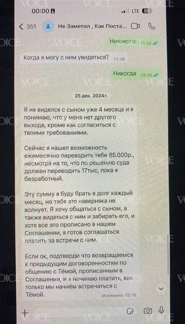 — Я не виделся с сыном уже четыре месяца и понимаю, что другого выхода у меня просто нет, — писал Александр. — Придётся согласиться на твои требования. Сейчас я смог найти возможность ежемесячно перечислять тебе 85 тысяч рублей, хотя по решению суда должен всего 17 — ведь официально я безработный. Эти деньги я буду занимать каждый месяц, но, думаю, тебя это не особо волнует. Мне важно другое — я хочу снова общаться с сыном, видеть его, забирать к себе. Всё это прописано в нашем соглашении, но если ты хочешь — я готов даже платить за встречи с ним. Если согласна, подтверди, что возвращаемся к прежним условиям общения с Тёмой, и я сразу начну переводы.