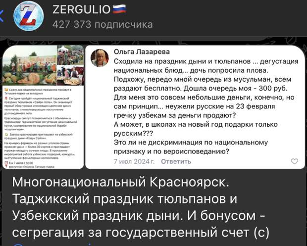 Сходила на праздник дыни и тюльпанов... дегустация национальных блюд... дочь попросила плова. Подхожу, передо мной очередь из мусульман, всем раздают бесплатно. Дошла очередь моя - 300 руб. Для меня это совсем небольшие деньги, конечно, но сам принцип... неужели русские на 23 февраля гречку узбекам за деньги продают? А может, в школах на Новый год подарки только русским??? Это ли не дискриминация по национальному признаку и по вероисповеданию?