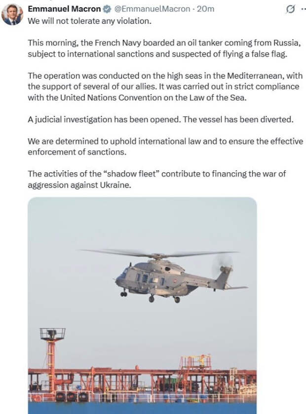 Операция была проведена в открытом море в Средиземноморье при поддержке нескольких наших союзников и в строгом соответствии с Конвенцией ООН по морскому праву. Возбуждено судебное расследование. Судно было перенаправлено. Мы твёрдо намерены отстаивать международное право и обеспечивать эффективное соблюдение санкций. Деятельность «теневого флота» способствует финансированию агрессивной войны против Украины", - написал Эмманюэль Макрон в соцсети X.